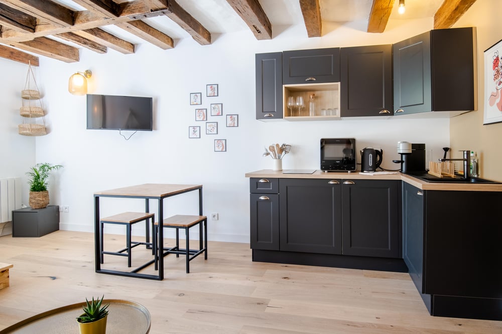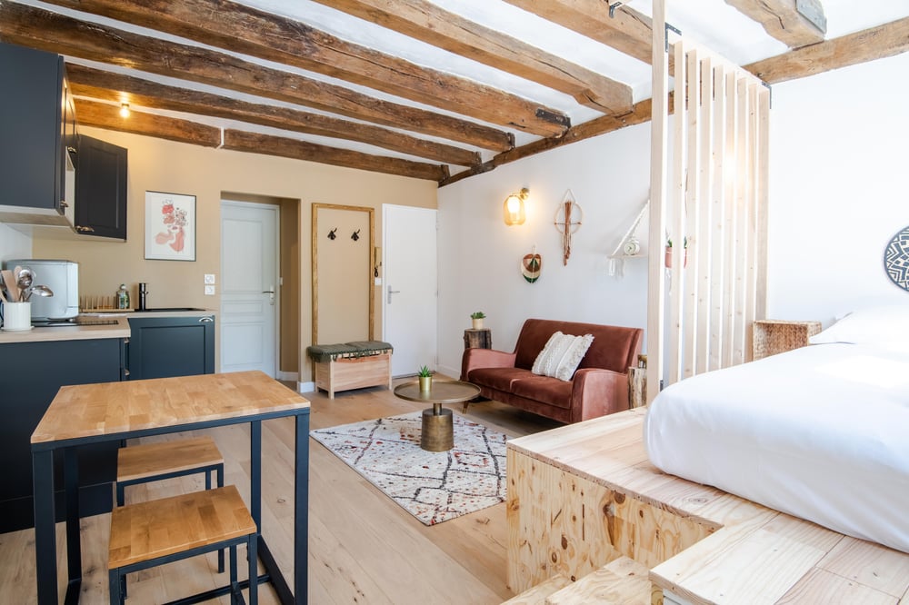 With a total surface area of ​​27m2, this accommodation will charm you with its decoration and its location. Its kitchen open to the living room will offer you all the necessary equipment for your stay (Tassimo coffee maker, kettle, microwave, etc.). The sleeping area has its own charm, with its two wooden steps. The comfortable sofa will allow you to enjoy a moment of relaxation in front of the television :) Please note that the apartment is not equipped with an internet connection. The bathroom includes a recent shower and toilet. You will enjoy an impeccable apartment thanks to cleaning carried out by a professional company and the accommodation will be equipped with the necessary linen such as towels, sheets, duvet covers, bath mats and tea towels. Everything is included in the cleaning fee.